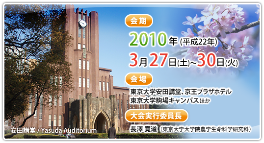 会期:2010年(平成22年)3月27日(土)~30日(火) 会場:東京大学安田講堂(総会・授賞式・受賞講演等)、京王プラザホテル(懇親会)、東京大学駒場キャンパス(一般講演・展示会・シンポジウム等)ほか 大会実行委員長:長澤 寛道(東京大学大学院農学生命科学研究科)