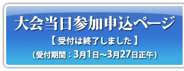 | 2013年03月01日 | 当日参加申込のWeb受付を開始いたしました(終了)。 受付:2013年3月1日(金)~2013年3月27日(水)正午 当日参加申込(懇親会のみ参加される方)はこちら(終了)。 |