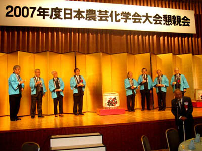 総会に引き続いて、2007年度の学会賞(2件)、功績賞(2件)、技術賞(2件)、奨励賞(10件)、の授賞式、B.B.B.論文賞(10件)とMost-Cited Paper Award(1件)の表彰式、第4回農芸化学研究企画賞(3件)の表彰式が行なわれた。午後には、各賞の受賞者講演が行われた。まず日本農芸化学会賞受賞者、阿部啓子氏(東京大学大学院農学生命科学研究科)による「味覚に関する分子生物学的・食品科学的研究」と村田幸作氏(京都大学大学院農学研究科)による「微生物「超チャネル」に関する分子生物学的・構造生物学的研究」の講演が行なわれ、それに引き続き日本農芸化学会功績賞の地神芳文氏(産業技術総合研究所・セルエンジニアリング研究部門)による「酵母の糖鎖生物学および糖鎖工学に関する研究」および藤田泰太郎氏(福山大学生命工学部)による「枯草菌代謝ネットワークのカタボライト制御の分子機作」の講演がなされた。農芸化学技術賞の講演は大島芳文氏ほか3氏((株)ミツカンおよび鈴峯女子短大)による「食酢の健康機能とおいしさの解明に基づく新飲用黒酢の開発」と三原康博氏ほか2氏(味の素(株))による「核酸系うま味調味料新製法の開発と工業化」が行なわれ、その後、農芸化学奨励賞の若手研究者10名による講演が行なわれた。