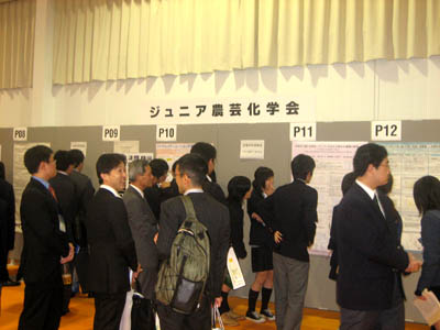 昨年度、本学会としては初の試みとして高校生による研究発表会を行ったが、今年度も引き続き「ジュニア農芸化学会」と称して開催した。展示会場となった桜丘アリーナの中3階を利用してポスター発表を行ったが、東京から7校8題、近辺の埼玉、栃木から2校3題、さらに新潟の他、遠く岡山、九州からの参加もあり、都合16題の高校生発表があった。また中学校からの参加希望が2校あり、特別編として同時に行った。多くの学会参加者からかなり専門的な質問やアドバイスがあり、討論が白熱して終了時刻を大幅に過ぎてしまうほどであった。高校生同士が互いのポスターを見る時間を1時間設けたが、これが好評だった。また今大会ではすべての発表に対し「ジュニア農芸化学会奨励賞」(高校)および「ジュニア農芸化学会努力賞」(中学)を授与した。終了後は東京農業大学「食と農」の博物館にて懇親会が催されたが、発表者同士の交流が活発に行われるなど大変盛会であった。なお、同発表会場では、26日にB.B.B.論文賞とMost-Cited Paper Awardのポスター発表が行われ、こちらも盛況であった。
