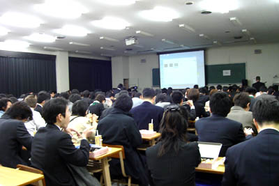 学内のレストラン「すずしろ」で25日に開かれたミキサーは300人ほどの収容定員が一杯になるほど非常に盛況であった。東京農大醸造科学科OBの蔵元からの寄贈による日本酒に多くの参加者が堪能した。