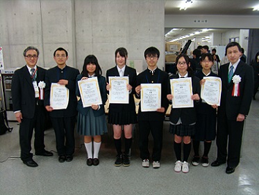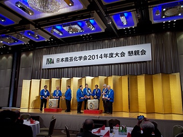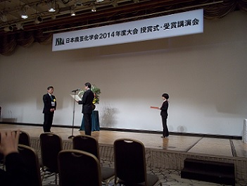 大会二日目には高校生の研究発表会「ジュニア農芸化学会」が開催された。全国54の高校から226人の発表者を迎えて54題のポスターが展示された。総数約450人が参加し、高校生の熱心な発表と大会参加者との活発な質疑応答に会場も大いに賑わった。投票の結果、金賞1件、銀賞2件、銅賞3件が選ばれた。今回の大会においても、本学会の被災地理科教育支援事業(「復興応援キリン絆プロジェクト」後援)の支援で、岩手、宮城、福島の被災3県から8校(生徒21人、引率教員8人)をジュニア農芸化学会に招待した。招聘校による8題の発表があり、発表終了後には支援目録の贈呈式も行われた。