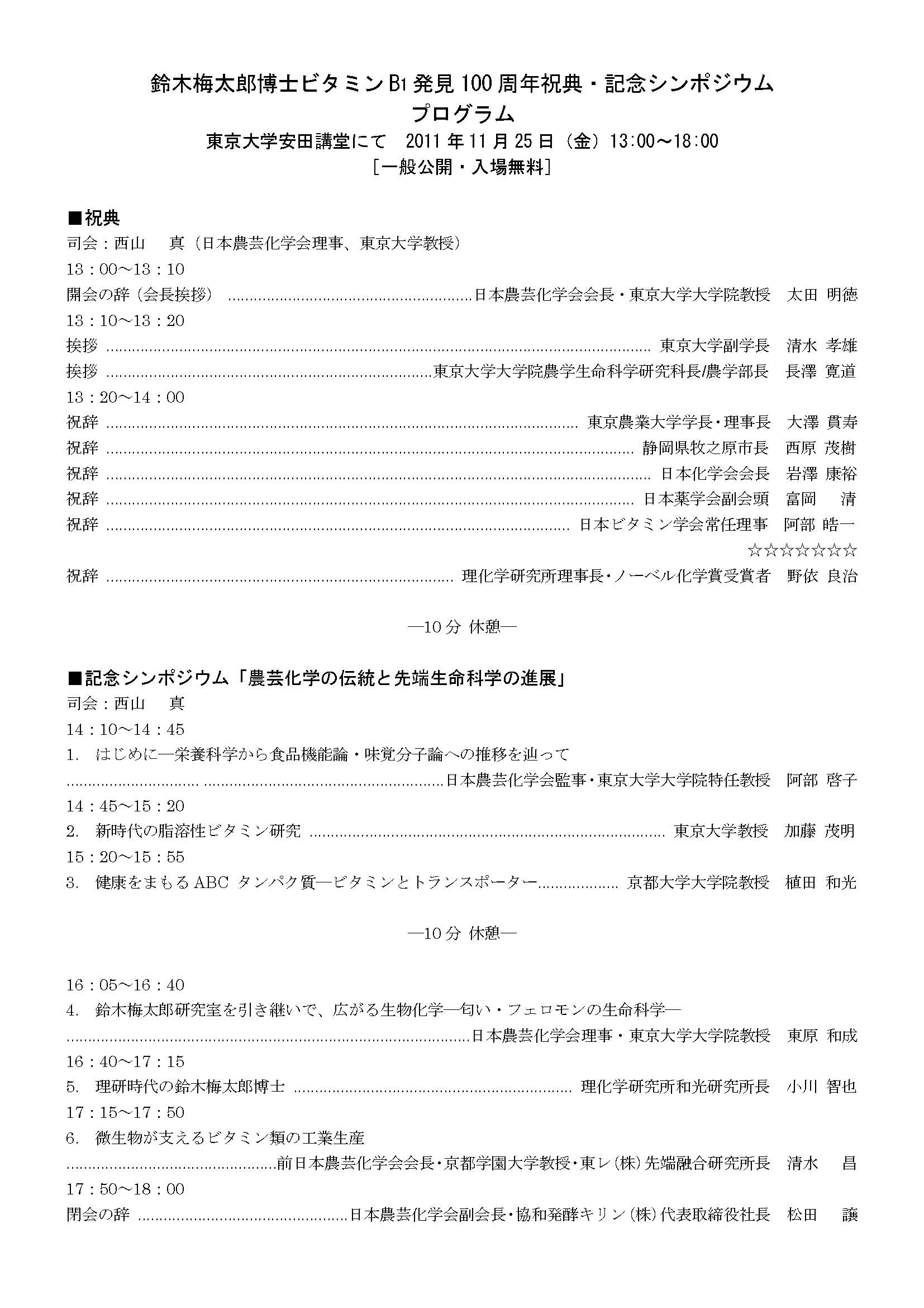 鈴木梅太郎博士ビタミンB1発見100周年祝典・記念シンポジウム