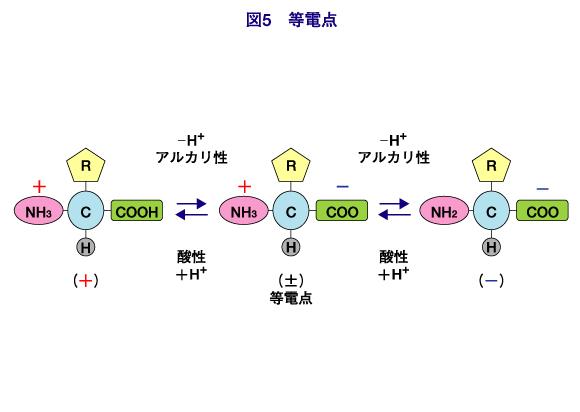 アミノ酸を構成しているアミノ基やカルボキシル基は、周りの水素イオン濃度(pH)に応じて、水素イオンを結合したり離したりする性質をもっています。その結果、アミノ酸自身も(+)、(±)、(-)のいずれかの電荷を帯びることになり、「両性物質」と呼ばれています。電荷が±0になる環境のpHを「等電点」と呼びます。