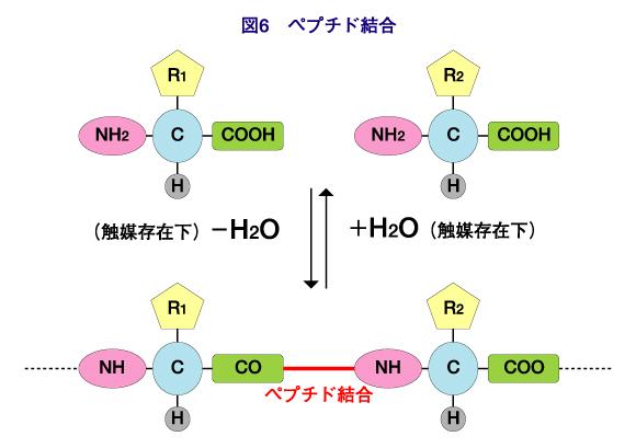 隣接するアミノ酸のカルボキシル基とアミノ基から水分子が除かれて(脱水縮合)生じた結合様式を「ペプチド結合」と呼びます。ペプチド結合によりアミノ酸が2〜100個程度つながった物質を「ペプチド」、100個以上つながった物質を「タンパク質」と呼びます。
