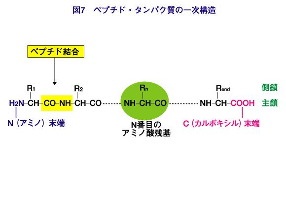 ●一次構造:ペプチドやタンパク質は、遺伝子配列情報に従って多数のアミノ酸が鎖状にペプチド結合でつながった構造をしています。このアミノ酸の並ぶ順序を「一次構造」と呼び、1つひとつのアミノ酸を「残基」と呼びます。一次構造には2つの末端が存在し(環状ペプチドを除く)、ペプチド結合で使われていないアミノ基を持った末端を「N末端」、同様にフリーのカルボキシル基を持った末端を「C末端」と呼びます。一般的に図で示す場合は、N末端を左側になるように描きます。