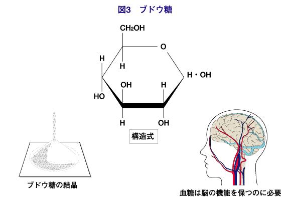 ブドウ糖(グルコース)は、デンプンやセルロースの構成成分として、自然界に最も多く存在する糖質です。微生物から動物まで、ほとんどの生物にとって最も重要なエネルギー源です。ヒトにとってもブドウ糖は究極のエネルギー源で、とくに脳はその機能するために常に一定量のブドウ糖を必要とします。そのためにわたしたちの体は、たとえ絶食しても血液中のブドウ糖濃度が一定に保たれるように工夫されています。