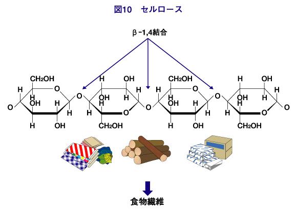木材、紙あるいは木綿の主成分はセルロースという多糖で、植物の細胞壁の構成成分です。このセルロースもブドウ糖が多数鎖状に結合したものです。この点ではデンプンと似ていますが、セルロースはブドウ糖がβ-1,4 結合したものであり、わたしたちの体内にある消化酵素では分解できません。野菜など食品中に含まれるセルロース画分は、以前は非栄養成分として無視されていましたが、近年は食物繊維としてわたしたちの健康維持に重要な働きをしていることがわかってきました。