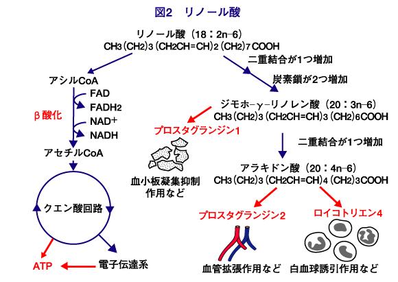 また、脂肪酸からエイコサノイドが作られます。必須脂肪酸であるリノール酸は不飽和化、長鎖化を繰り返してアラキドン酸になり、プロスタグランジンやロイコトリエンなどの生理活性物質が合成されます。