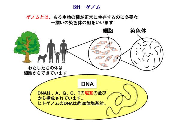 ゲノムとは、ある生物の種が正常に生存するのに必要な一揃いの染色体の組をいいます。真核生物では、DNAに書き込まれた遺伝情報は核の中にタンパク質と結合して存在しており、塩基性の色素で染まりやすいことから染色体と名付けられました。なお、核構造を持たない原核生物の遺伝子群や、ミトコンドリア、葉緑体の遺伝子群も染色体と呼びます。通常の二倍体細胞では、その半数体に含まれる遺伝情報を意味します。