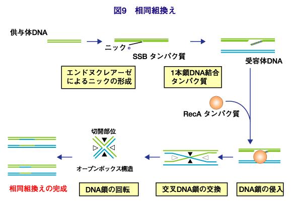 数百塩基対が、同一かまたはきわめて類似した塩基配列を持っている2組のDNAのその領域でDNAの交換が行われることを相同組換え(homologous recombination)といいます。大腸菌を例にあげて説明します。