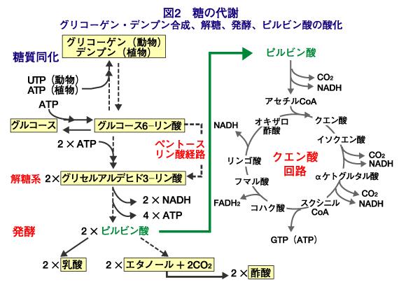 グルコースは細胞内に取り込まれるとリン酸化され、グルコース6リン酸になります。ここから、グルコースは、3つの異なった運命をたどることになります。十分エネルギーがある状態では、同化され多糖類(グリコーゲンやデンプン)となります。一方、エネルギーが不足している場合は、異化反応、すなわち解糖系あるいはペントースリン酸経路を経て分解されることになります。