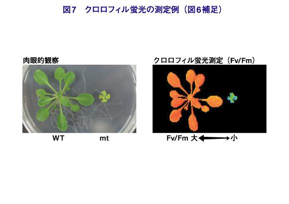 葉緑体での遺伝子機能や遺伝子発現に関係する遺伝子に変異がはいった突然変異株(左図 mt)は、光合成活性が低下するため、生育が遅く、変異のない植物(野生型と呼ぶ。左図 WT)と比べて植物のサイズが小さいままです。生育を比較するだけでは、生育低下の原因はわかりませんが、クロロフィル蛍光測定により、光合成活性のパラメータ(右図 Fv/Fm)を比較すると変異株では、野生型に比べ光合成が低下(画像解析では青く見える)していることがわかります。この方法を応用して、生育にはあまり差のないような多種類の突然変異体の中からも、光合成に関連する遺伝子に変異のある植物を簡単に選びだすことができます。その植物をさらに調べ、どの遺伝子が変異しているか突き止めることで、光合成についての新しい研究につながることもあります。実際、この方法で数多くの重要な発見がなされています。