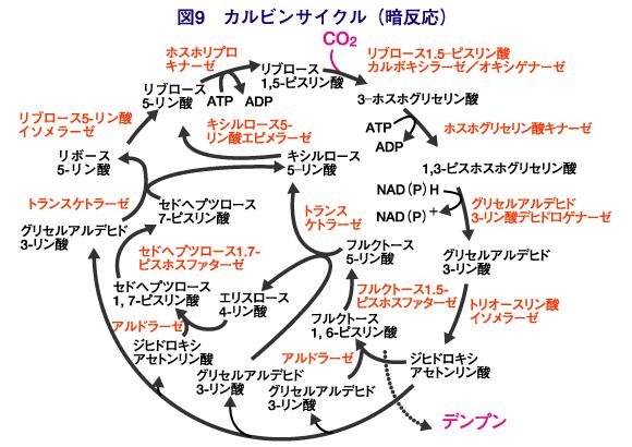 炭酸ガス固定の過程はリブロース1,5-ビスリン酸カルボキシラーゼ/オキシゲナーゼ(Rubisco)に触媒され、CO2とリブロース1,5-ビスリン酸から2分子の3-ホスホグリセリン酸が生じます。第2過程は還元反応で、ATP を用いて3-ホスホグリセリン酸が1,3-ビスホスホグリセリン酸に変換され、続いてこれがグリセルアルデヒド3-リン酸デヒドロゲナーゼでNAD(P)Hにより還元され、グリセルアルデヒド3-リン酸を生じます。この過程でCO2はCH2O のレベルまで還元されます。次の段階であるリブロース1,5-ビスリン酸再生過程では、3、4、6、7炭糖間で一連の縮合・転移反応が行われて5炭糖が生成します。最後に5炭糖であるリブロース5-リン酸にホスホリブロキナーゼの触媒でリン酸が付加されてCO2の受けてであるリブロース1,5-ビスリン酸が再生されカルビンサイクルが完結します。