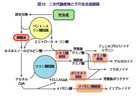 植物の二次代謝は、その生合成系、あるいは化合物の特性から、イソプレノイド系(テルペノイド)、アルカロイド系、フェニルプロパノイド系に分類されており、それぞれ、約 25,000 種、約12,000 種、約 8,000 種の二次代謝物の存在が明らかになっています。これらの生合成系は独立したものではなく、相互に入り組んでいます。