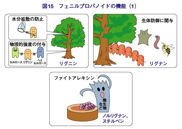 種々のリグナンが、抗菌性等、微生物・植物・昆虫等に様々な生理活性を示すことが知られていますので、リグナンは植物の生体防御に関わっていると考えられています。またリグナンは、樹木特有の形質である心材(樹幹の中心部の全て死細胞からなる木部で、濃色に着色していることが多い)に著量蓄積しており、心材の耐朽性付与に関わっていると考えられています。