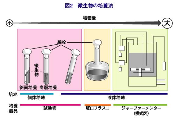 微生物の研究や利用には、目的の微生物だけを特別な培地(培養基)で純粋培養する必要があります。微生物の種類や研究・利用目的に応じて、適切な培養器具、培地(固体・液体培地、天然・合成培地)と培養条件(温度、量、時間、空気の有無など)を選択します。培地や器具は前もって完全に滅菌しておき、目的の微生物だけを増殖させます。