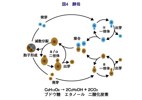 「酵母」は、イースト菌とも呼ばれる単細胞性を示す真菌類の総称です。一組の染色体をもつ一倍体と、二組の染色体をもつ二倍体の世代の生活環をもちます。出芽酵母のSaccharomyces cerevisiae(サッカロマイセス・セレビシエ)は有名で、糖を代謝してアルコール発酵を行います。酵母は、パン、味噌、醤油、みりん、ビール、日本酒などの食品製造に欠かせない微生物で、さらに将来の高度利用が期待されます。