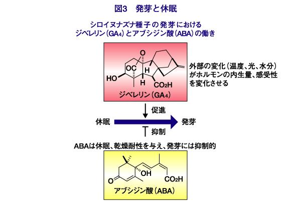 植物は「受精」により「種子を形成」します。一方、種子の多くは、種子の成熟・発達の過程で「休眠」状態に入り、厳しい環境にも長い年月生き続けることができます。また、光、水分、温度などが「発芽」に相応しい状態におかれると、今まで抑えられていた種子の遺伝子が動き始め、発芽が誘導されます。これらの「発芽と休眠」の現象は、植物ホルモンであるジベレリン(GA)とアブシジン酸(ABA)によって巧妙に調節されています。たとえば、ABAの生合成が抑制されると、休眠が起こらずに、穂発芽とよばれる、穂の状態での発芽が起こります。一方、種子が発芽するとき、種子の中の養分、たとえばデンプンは分解され、グルコースとして胚の生長、さらには、伸長生長に利用されます。発芽に機能するジベレリンはデンプンの分解に作用するアミラーゼの誘導を行います。これらの過程は、農芸化学者によって詳しく研究されてきました。