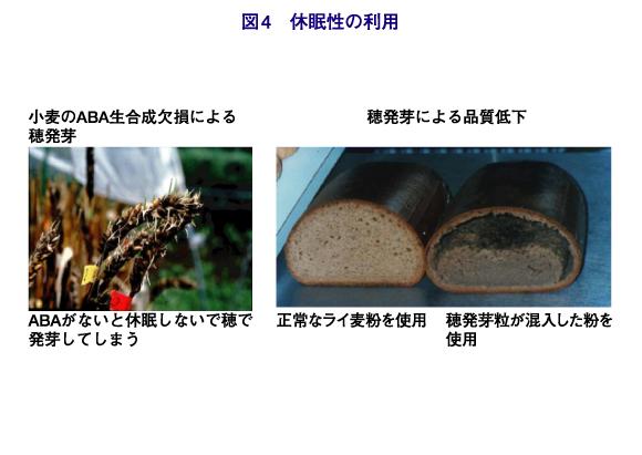 植物は種子の状態で長い年月、死なずに生き続けることができます。この休眠性はABAというホルモンによって制御されています。このような植物種子の性質(休眠性)は、作物としての利用を可能にしています。 発芽することにより、種子に貯えられた養分は分解され、生長に利用されます。ビール発酵では麦芽におけるデンプン糖化の過程を利用しています。一方、穂発芽は収穫を妨げるばかりか、種子の性質を変え、パンなどの製造に悪い影響を及ぼします。