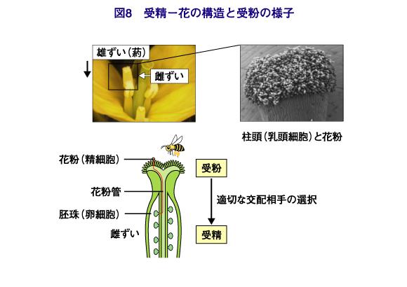 雌ずいには、昆虫などによってさまざまな花粉が運ばれてきますが、植物はこの受粉から受精に至る生殖過程で、適切な交配相手を選択しています。たとえば種の異なる花粉は、交配相手として不適切であり、受精過程で除去されます。この性質は「種間不和合性」と呼ばれていますが、その機構はまだほとんどわかっていません。多くの植物は、同じ種の花粉であっても、自己(同じ植物体)の花粉を除去する性質をもっています。「自家不和合性」と呼ばれるこの性質は、自殖による悪い影響(自殖劣勢)を避け、種の遺伝的な多様性を維持していくために、とても重要な性質だと考えられています。今、この自家不和合性を制御している遺伝子の役割(アブラナ科)がわかりつつあり、自家不和合性の制御によって、よりよい性質をもったハイブリッド種子の生産が試みられています。