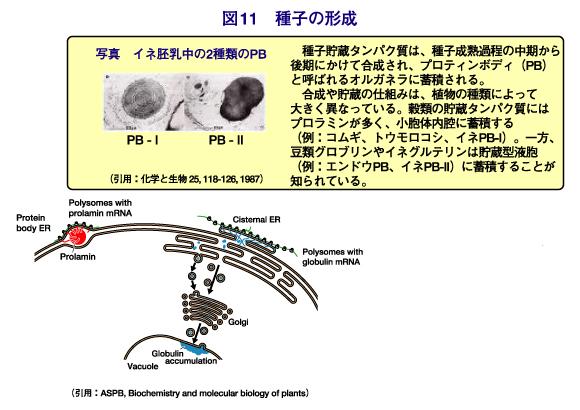 種子における貯蔵タンパク質は、特によく研究されており、その遺伝子は、もっとも早くに単離されたものです。さらに、その遺伝子の発現制御や、細胞内での蓄積が詳細に解析され、植物における遺伝子の役割を知る重要な材料として、また、食資源のさらなる改良のために、現在も研究が積極的に行われています。