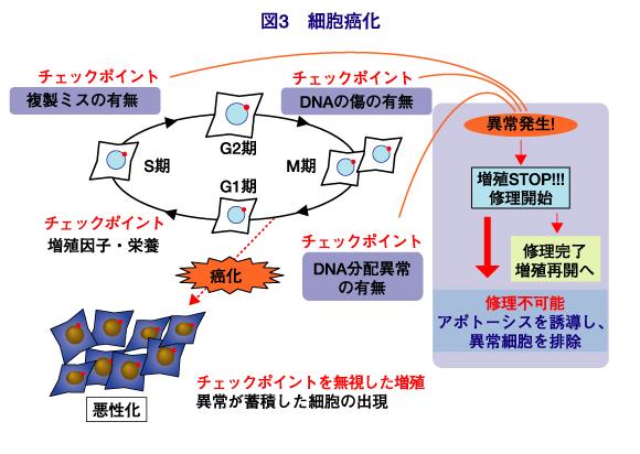 細胞は自分の置かれた環境や、複製や紫外線などによって生じた遺伝子の傷などを常に監視しており、増殖に適していない状況下では環境の改善、遺伝子の傷が治るまで自らの増殖を止める「チェックポイント」機構が存在します。遺伝子の修復が完了すると増殖は再開されますが、修復が不可能だと修復をあきらめ、細胞は自らを死に追いやることで個体の生存を図ろうとします。しかし、このチェックポイント機構がうまく働かず細胞の癌化が起きると、環境や遺伝子異常を無視して無制限に増殖を繰り返す細胞、いわゆる「癌細胞」となり、個体の生存を脅かす存在になります。