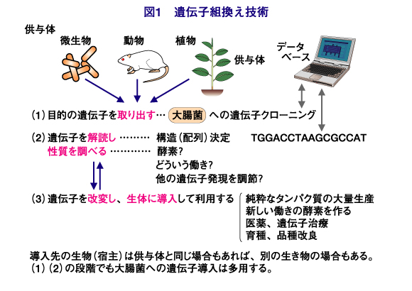 現代では基本的にほとんどすべての遺伝子を知ることや利用することが可能です。遺伝子組換え技術は、考え方として、(1)目的の遺伝子を純粋に取り出す、(2)その遺伝子の構造を解読し、性質を調べる、また多くの場合は、(3)その遺伝子に何らかの手を加えた後、生き物に導入して発現させ、その生き物の性質を変える―という3つの段階から成り立っています。