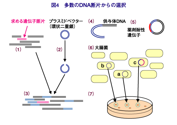 ベクターには薬剤耐性遺伝子が乗っているので、プラスミドの入った細胞だけが薬剤に耐性となり、抗生物質を含んだ寒天培地上にコロニーを形成します。しかしそのほとんどは、[求めるものでない供与体DNAを含んだ組換えDNA分子(a)、あるいは供与体DNAを含まずにベクターDNAが環状に戻った分子(b)]の入った細胞のコロニーであり、わずかに存在するはずの、目的の供与体DNA断片を含んだプラスミド(c)を取り込んだ細胞からなるコロニーを、いろいろな方法を使って見つけ出さなければなりません。