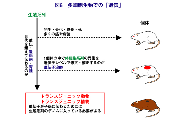 多細胞生物では、身体を作る体細胞で起こる遺伝現象と、親から子へ伝わる生殖細胞の系列での遺伝現象を区別しなければなりません。癌や他の病気の多くは体細胞系列で起こる異常で、これらは世代間を「遺伝」しないので、遺伝子が関与していていも「遺伝病」とは言いません。そして、現在、遺伝子治療と呼ばれているのは、おもにこの体細胞で起こった異常を正す遺伝子の操作のことです。これに対して、遺伝病は、生殖細胞を通じて世代間に伝わって発病する病気です。遺伝病によって起こった身体の異常を遺伝子治療する試みはありますが、遺伝病そのものを治すわけではありません。また、作物や家畜における育種や品種改良でも、生殖細胞のゲノムで変化がおこることが必要です。