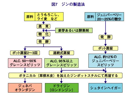 グレーンウイスキーのように、デンプン質原料とそれを糖化するのに麦芽(場合によると酵素剤)を用いて、単式または連続式蒸留器で原料になるグレーンスピリッツを製造します。次いで、別途にジュニパベリーから同様にしてつくった蒸留酒を混ぜて蒸留するものや、グレーンスピリッツに水とジェニパベリーや他のボタニカルを加えて単式蒸留するもの、または、ジン・ヘッドという金網でできた筒に、ジェニパベリーや他の草根木皮を入れて、これを単式蒸留器の上部に付けてグレンスピリッツを蒸留するものなど、特徴とするジュニパベリーの香味の付け方に工夫をしたバリエーションがあります。