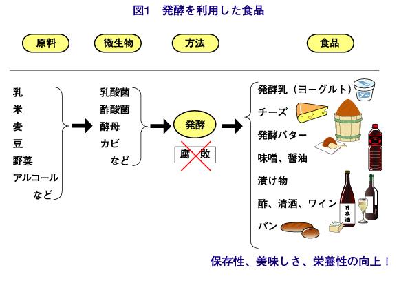 わたしたちは上手に微生物を利用して、生活を豊かにしてきました。微生物が増殖して好ましい状態になった場合を「発酵」、反対の場合を「腐敗」と区別しています。代表的な発酵には、乳酸菌による乳酸発酵、酵母によるアルコール発酵などがあります。冷蔵庫が普及していない土地では、乳酸菌を使ってpHを下げることで、食品などの長期保蔵が可能となります。チーズやヨーグルトも、乳酸発酵で腐敗しやすい牛乳を長期保存することができるようにしたものです。ここでは、身近な発酵食品について紹介します。