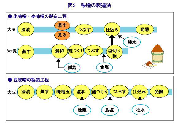「味噌」の主原料は大豆であり、麹菌(Aspergillus oryzae)で発酵させた発酵食品です。麹(こうじ)を作る際の原料により、米味噌、麦味噌、豆味噌に分類され、製造工程が異なります。わが国では米味噌が全体の8割を占めます。大豆のタンパク質はタンパク質分解酵素で、デンプンはα-アミラーゼで、脂質はリパーゼで分解され、発酵が進んで「味噌」となります。また、麹菌のほかにも、耐塩性の酵母や乳酸菌が働き、種々の香気成分や酸を生産して味噌独特の風味をつくり出します。