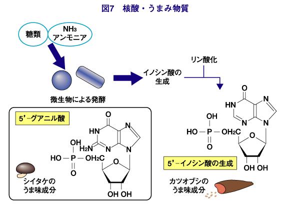 微生物を利用して核酸や旨味物質を大量に生産する方法を、「核酸発酵」と呼びます。5’-イノシン酸(鰹節の旨味成分)や5’-グアニル酸(椎茸の旨味成分)は、核酸系「旨味物質」と呼ばれます。5’-イノシン酸は、糖類とアンモニアを含む培養液で微生物を培養してイノシン酸を生成させ、ついで、リン酸化してつくる「発酵法」や、酵母からつくる「酵母核酸分解法」がよく知られています。