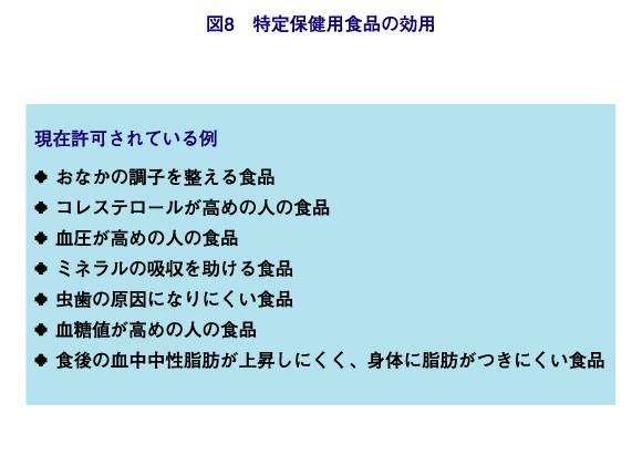 現在許可されている特定保健用食品の効用の例として、「おなかの調子を整える食品」という表示が許可されている食品群は、「はっ酵乳・乳酸菌飲料」(プロバイオティクス食品)と「オリゴ糖類を含む食品」、「食物繊維類を含む食品」「プロピオン酸菌乳清発酵物」(いずれもプレバイオティクス食品)の4群に分類されます。