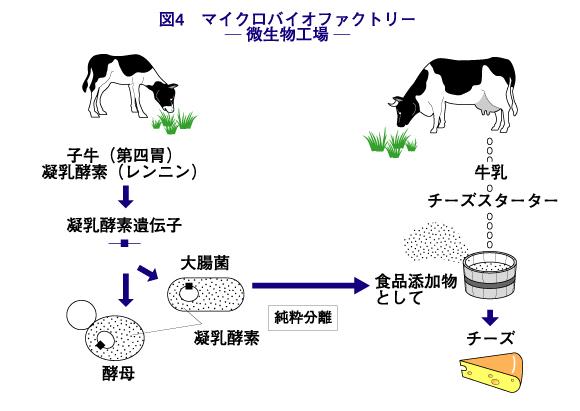 チーズなどの乳製品を作るのに使用されるキモシンは、子牛の凝乳酵素(レンニン)の遺伝子を大腸菌や酵母で発現させて生産されます。この場合、遺伝子組換え微生物全体を食品として利用するのではなく、キモシンのみを取り出して利用します。そのため、キモシンは食品添加物として扱われます。デンプンの分解に利用されるα-アミラーゼやパンの製造や飼料として利用されるリボフラビン(ビタミンB2)も遺伝子組換え微生物で作られ、食品添加物として扱われています。微生物を生産工場として有用な物質がつくられています。