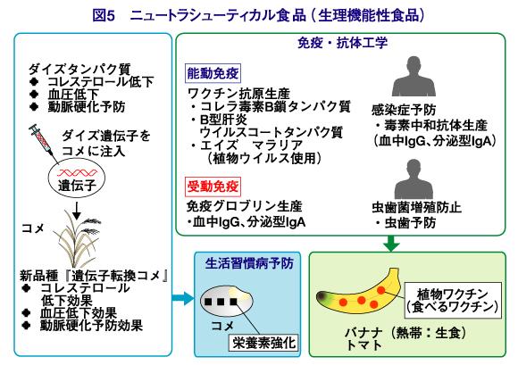 体の免疫力を増加させて疾病を予防する遺伝子組換え作物が作成されています。その方法は、能動免疫と受動免疫に分けられます。前者は、ワクチンを作物につくらせ、それを摂取することにより体に抗体をつくらせ免疫力を高める方法です。後者は、抗体を作物につくらせ、それを直接摂取する方法で、即効性が期待できます。また、ワクチンによっては抗体誘導力が弱い(免疫寛容といいます)ものもあります。そのような場合には、ワクチンをコレラ毒素などの一部と融合させて用いられます。このような方法で、多様なニュートラシューティカルがつくられています。医薬的な機能を持つ食品の場合には、詳細な安全性評価が行われます。