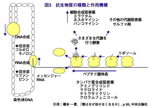 現在抗菌剤として用いられている抗生物質は、細菌に存在するさまざまな生合成過程に関与する酵素を阻害し、細菌の増殖を阻止あるいは殺すことができます。阻害する生合成の段階は主として次の4種類の酵素です。