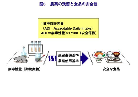 わたしたちが毎日食べる食品は、安全なものでなければなりません。食品としての安全性確保のため、動物実験などをもとに決められた一生涯毎日摂取しても影響がない量(ADI)などから、食品中に許容される基準として残留農薬基準が定められています。これを超えることがないように、それぞれの農薬の使用時期、使用量、使用回数などの使用方法が決められています。