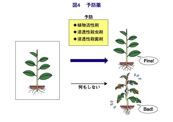 病原菌、害虫、雑草の発生、侵入または加害を予防する効果を示す薬剤を「予防薬」といいます。病原菌の場合、発病前あるいは発病のごく初期に散布すると効果が高く、一般に効果の持続性も長いのですが、病勢が進行してからでは効果が現われにくいのが難点です。したがって、不必要に散布することなく、十分な効果を上げるために、使用する時期などの選択が重要です。植物に浸透して、加害する病害虫のみに作用する「浸透性薬剤」や植物の抵抗性を誘導する「活性化剤」と呼ばれる薬剤があります。これらを用いて病害を未然に防ぐことで、高品質の野菜や果実を得ることができます。