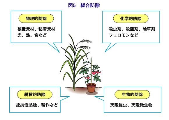 病害虫・雑草からの被害を防ぐために、化学物質を用いた化学的手段だけに頼るのではなく、さまざまな防除手段を互いに補い合うように組み合わせて行う「総合防除」という防除法があります。天敵昆虫などの生物的手段をはじめ、品種や栽培法を変えた病害虫・雑草の発生の防止や、ネットや光による物理的な防除手段の利用、さらには害虫の生態を混乱させるフェロモン剤などを用います。総合防除により、経済的な被害を出さないようなレベルに病害虫・雑草の密度を保つことで、殺虫剤など化学物質の散布量を最小限に抑えることができます。
