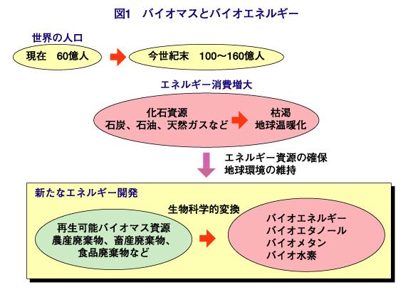 世界の人口は、現在約64億人ですが、近い将来100億人に達すると予想され、必要なエネルギーも急増していくと考えられます。現在のエネルギー資源の多くは、石炭、石油、天然ガスなどの化石資源ですが、これらの資源は有限であり、近い将来枯渇することが予想されます。このようなエネルギー問題を解決するために、再生可能な資源である「バイオマス」を原料とした「バイオエネルギー」の開発が期待されています。