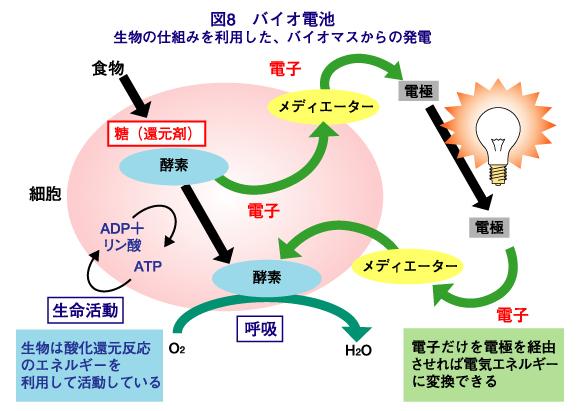 化学エネルギーを電気エネルギーに変換する電池系は、原理上、適切な触媒さえあればどのような還元剤と酸化剤を組み合わせてもかまいません。一方、地球上の酸化還元反応(元素サイクル)のほとんどは生体触媒が関与しています。そこで、生体系に見習ったエネルギー変換システムを構築するという考え方が生まれます。