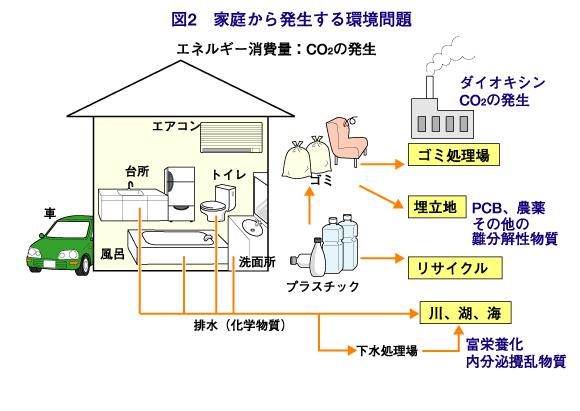 わたしたちの日常生活は様々な化学物質の恩恵を受けていますが、これらの物質は使用後、必ずゴミとなります。プラスチック製品は、リサイクルしなければ石油資源のむだ遣いになり、環境中の腐らないゴミとして生態系に蓄積します。またゴミの焼却炉などから発生するダイオキシンや、かつて使用されていたPCB(ポリ塩化ビフェニール)、あるいは農薬などは、生分解性が極めて低く毒性が高い物質として、今も環境中に残存しています。またある種の化学物質は、内分泌撹乱物質(環境ホルモン)として生態系を脅かす存在です。