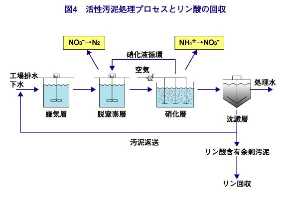 排水処理には、活性汚泥処理プロセスが広く利用されています。活性汚泥は各種の微生物から構成され、有機物(BOD成分)は各種の微生物によって酸化分解され、窒素は硝化細菌群と脱窒素細菌群によって、最終的に窒素ガス(N2)として除去されます。一方リンは、ポリリン酸蓄積細菌によって菌体内に蓄積されます。ポリリン酸を蓄積した活性汚泥からリン酸を資源として回収することができます。