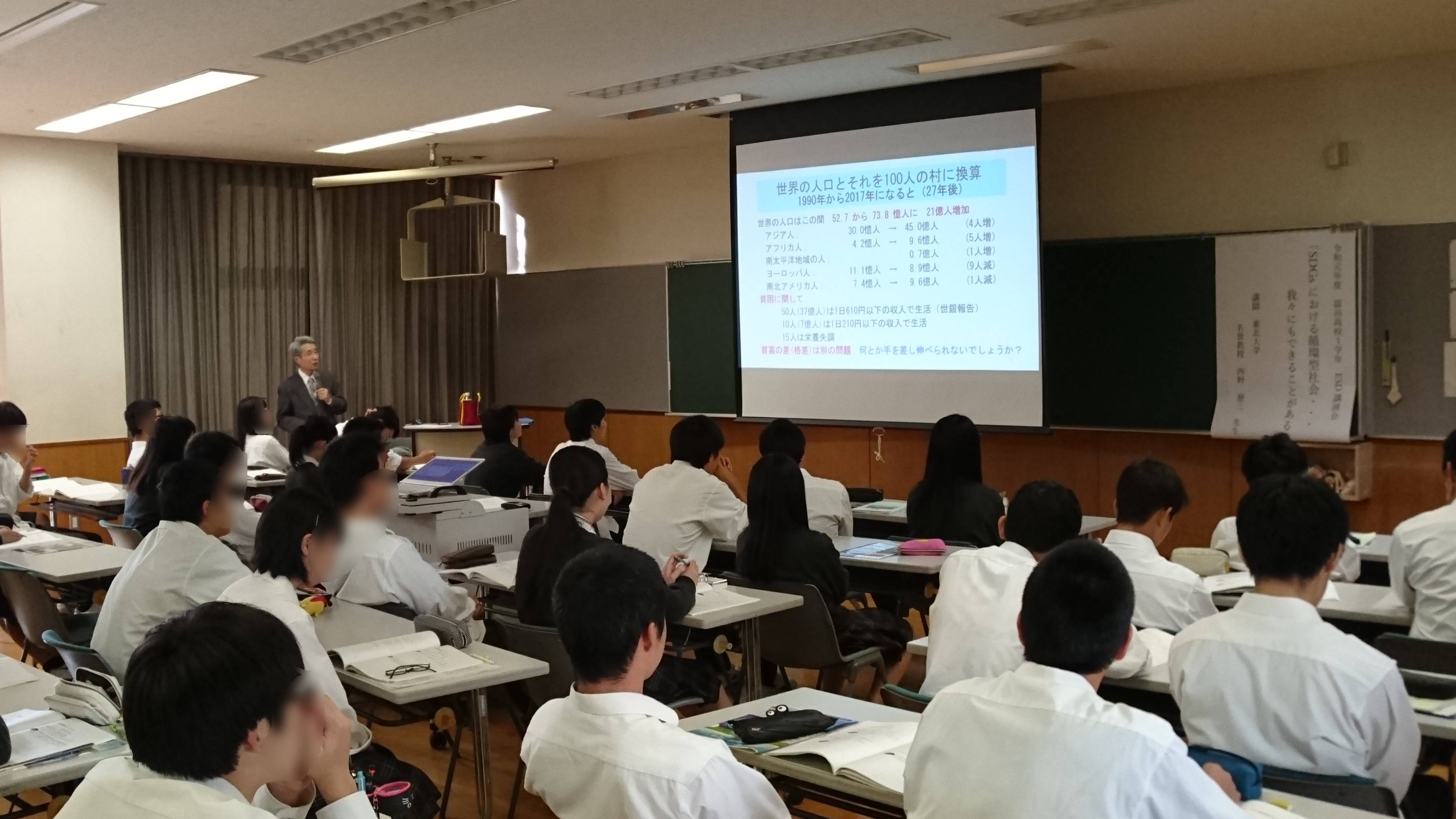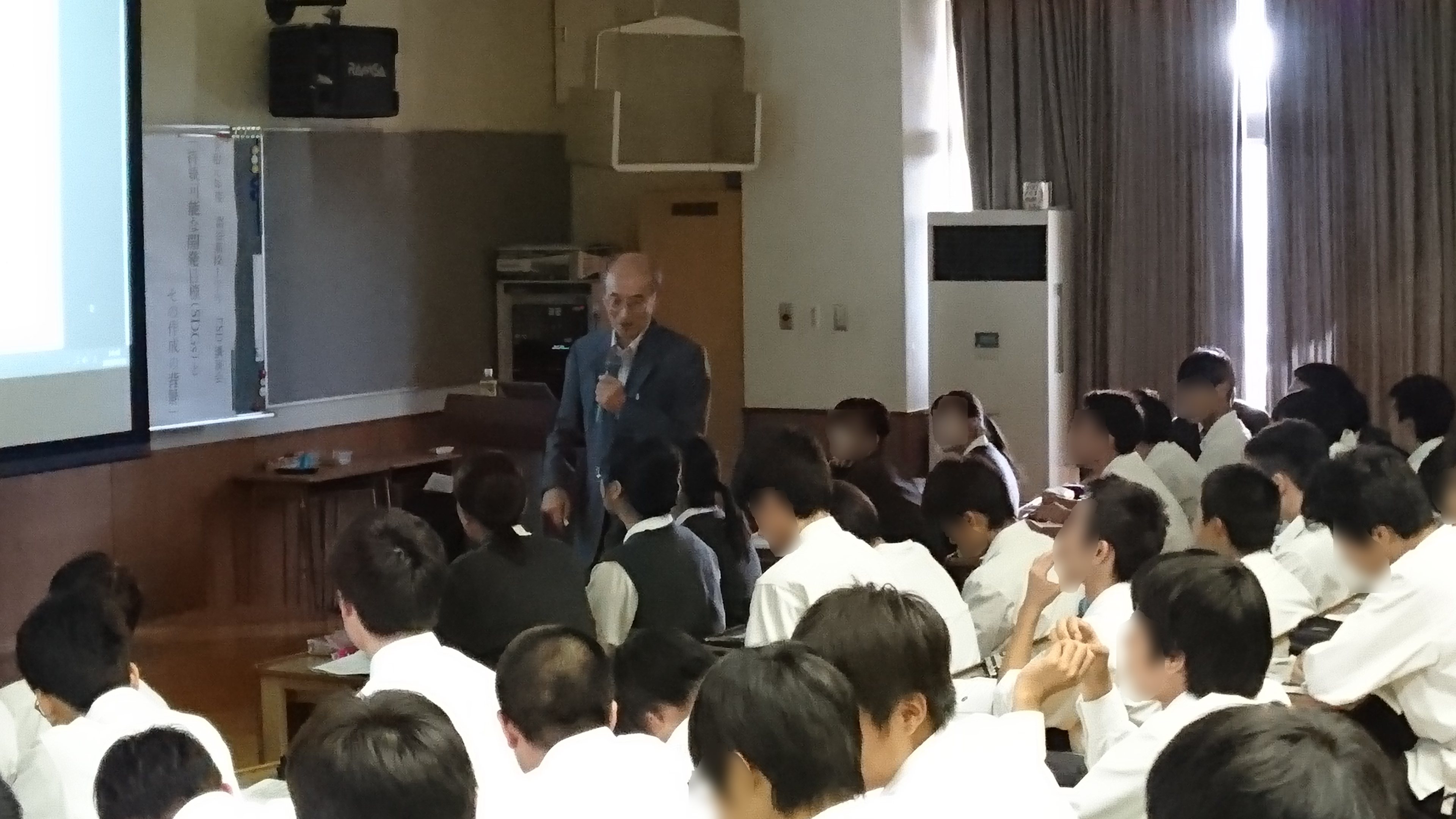 | 報告 | 溝口先生からはSDGsの歴史について細かく説明していただき,その言葉自体は新しいものであるが,考え方は以前から様々な分野で取り上げられてきたことが良く分かる内容であった。 西野先生からは江戸時代の循環型社会を事例として取り上げていただき,自分たちが排出したものを再利用することで余分なエネルギーを生み出さず,自己完結できていたことを知ることができた。また,江戸時代の階級によって回収される人糞の価値が異なることや,当時の流れを組む店があることについても触れる機会があり,生徒の興味関心を引き付ける内容であった。 遠藤先生からは水問題が様々な問題と絡み合っていることを説明していただき,カンボジアでの取り組み事例を元に、メコン川の水質調査を生徒と一緒に行った。見た目は問題なさそうに見えるメコン川の水も,鉄やマンガン・ヒ素などの有害物質を含んでおり,それが農作物にも使われている現状を知ることができた。 普段の高校生活では触れることができない問題点や,物事を見つめる新たな切り口について,3人の先生方から講義を行っていただき,生徒たちにとって新鮮で非常に良い経験となりました。 |