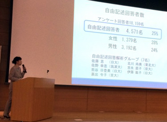 本学会の裏出令子氏は、4571名から寄せられた自由回答を分析、研究者・技術者の置かれている現状、問題点、意識及び要望について取りまとめた結果を講演した。全回答者に対する自由記述回答者の割合は、女性28%(1379名)、男性24%(3192名)であり、35歳以降で女性記述回答者の比率が男性より高くなり、特に45歳から65歳未満の年齢層で男女差が大きかった。回答は、記述内容にそって、WLB、ポスドク、キャリアパス、数値目標、進路選択促進、意識改革の6項目に分類され、いずれも、第3回の調査でも記述回答が多く、この6項目の問題が未だ十分に解決されていないことが考えられた。この6項目の中で、最も回答数が多かったのは数値目標の項目で、女性の意見は反対意見63%、賛成意見20%であったのに対し、男性の意見は反対意見85%、賛成意見9%であり、数値目標に対する意識改革がまだまだ必要と感じられた。