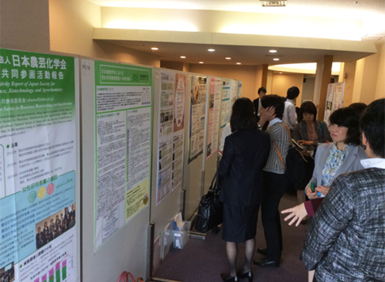 昼食時の11時30分から13時はポスターセッションが開催された。農芸化学会では恩田先生が作成されたポスターが展示され、大変分かりやすく、多くの方が興味深く見られていた(写真2)。ポスターセッションでは、日本化学会及び日本数学会で、それぞれ2018年から女性初の学会長及び2015年から女性初理事長が就任したことが報告されており、大変興味深かった。農芸化学会も近いうちにそのようなことになれば望ましく、また、いずれ当たり前でニュースにもならなくなる時期が来ることが期待された。