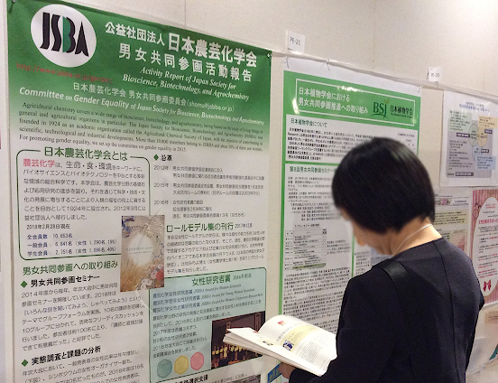 昼の部(11:00~13:00)ではポスターセッションが行われ、日本農芸化学会を含む45の加盟学協会が活動報告を行った。昼食時間を兼ねているにも関わらず、多くの参加者が食事もそこそこにブースを訪れ、活発な議論が交わされた。日本農芸化学会における昨年度の男女共同参画活動のトピックスの1つは、やはり『農芸化学分野のロールモデルたち』の刊行であろう。実際、本学会の発表ブースを訪れたほぼ全員が、このロールモデル集を手に取り、内容や刊行に至った経緯について多くの質問があった。また、吉永氏による美しい表紙デザインや上質な製本も好評で、しっかりとした形ある物が持つ"説得力"の大きさを感じた。