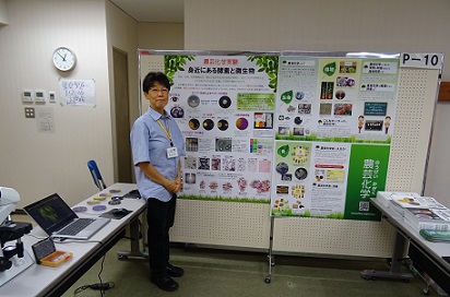 今回初めて、日本農芸化学会から恩田真紀氏(大阪府立大)と裏出令子(京都大)が、8月7日の「ポスター展示・キャリア相談」「Gate Way」「研究者・技術者やTAへのキャリア・進学懇談会」に参加した。出展したブースには途切れることなく生徒たちが訪れ、恩田氏が入念に準備された食品に含まれるさまざまな微生物とそれらが分泌している酵素を目で見る模擬実験に見入り、わかりやすい説明に熱心に耳を傾けていた。